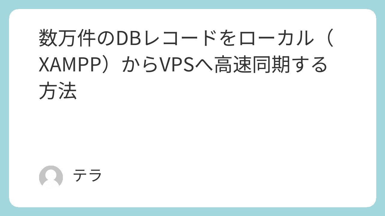開発環境(Local)でスクレイピングやAIによるデータ加工を行い、完成したデータを本番環境(VPS)へ反映させる際、数万件規模になると通常のインポート/エクスポートでは手間がかかり、タイムアウトのリスクも伴います。